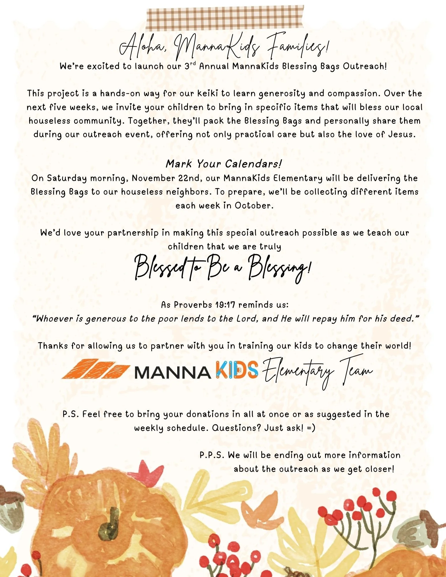 We offer in-person experiences for Nursery (0-23mo), Preschool (ages 2-5), and Elementary (K-5th Grade)! We also offer VSK (Very Special Keiki) assitance for our keiki with special needs. If your keiki plan to join our MannaKids experiences, you can check them in at our MannaKids Check-In table when you arrive.